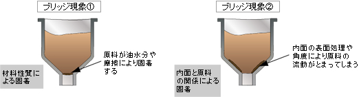 ホッパーによくあるトラブルとしてブリッジ現象が代表的です。ブリッジ現象は原料の水分や摩擦などによる固着やホッパー内面の表面仕上げ方や角度などの複数要因が複雑絡み発生し、原料の排出機能を止めてしまいます。
