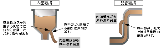 摩擦係数や硬度が高い原料を取扱う場合にはホッパー内面に穴が空いたり、配管に穴が空きそこから原料がこぼれることがあります。またホッパーを製作する際の溶接や板材の組合わせも製品の強度に大きく影響します。